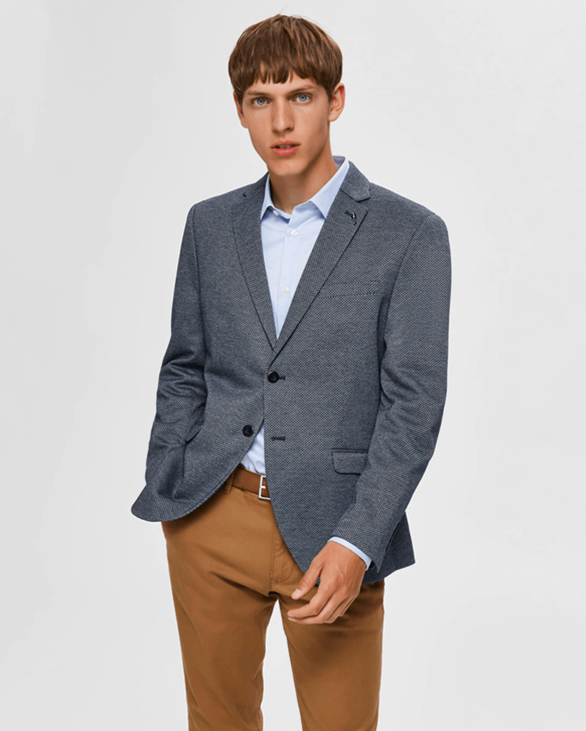 También lo será el traje azul elástico, de corte “slim”. Un tipo de traje que marca tendencia desde hace varios años y que de nuevo se va a imponer para el 2022.